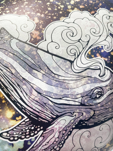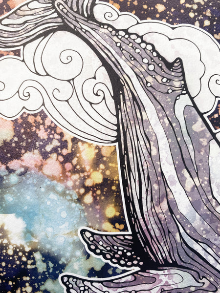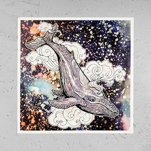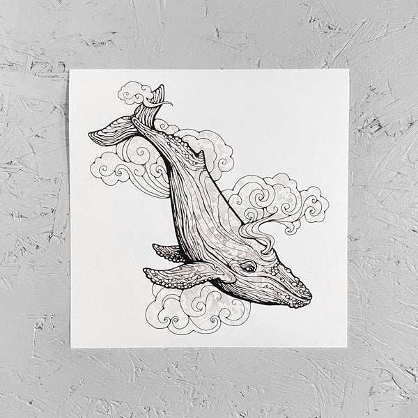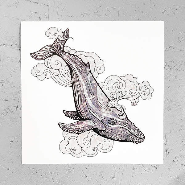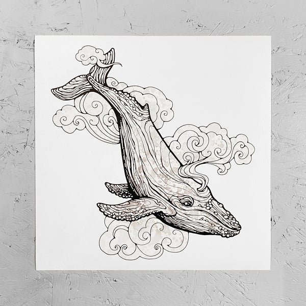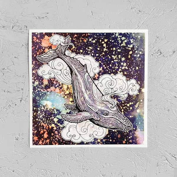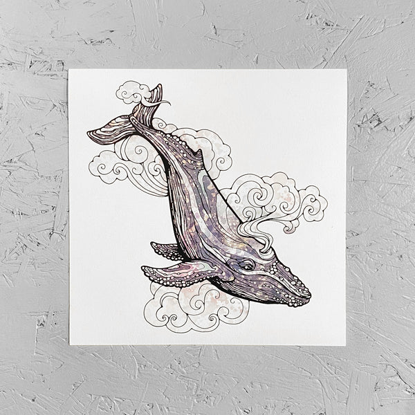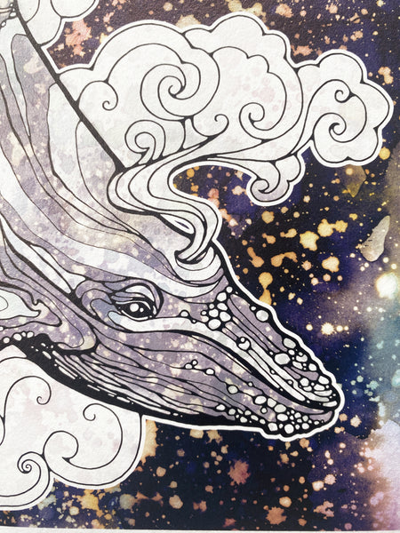 This print is a digitally produced giclée print with all its components hand-prepared on paper (with fineliners for the body and watercolours for the splashes on separate sheets). The colour layers were then scanned, digitally post-produced and merged together.